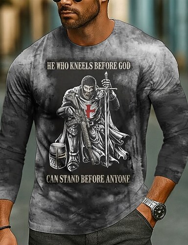 Herren Kreuzritter Tempelritter T-Shirt Langarm T-Shirt 3D-Druck Rundhalshemd Mode Basic Lässig Alltag Straße Braun Grün Grau Sommer Frühling Bekleidung