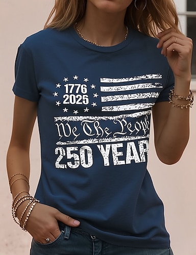 Unabhängigkeitstag Amerikanisches Jubiläum Patriotischer Damen T-Shirt Druck Grafik Flagge Stylisch Klassisch Lässig Kurze Ärmel V-Ausschnitt Reguläre Oberteile Alltag Blau Schwarz Rot Rot Blau
