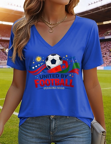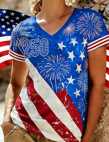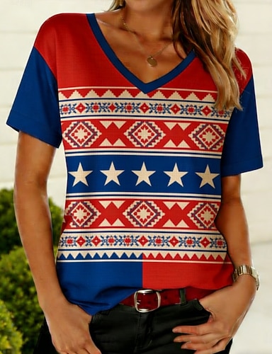Amerikanischer Unabhängigkeitstag Damen T Shirt Druck Grafik Flagge Vintage Stilvoll Klassisch Kurzarm V Ausschnitt Normale Oberteile Täglich Blau Weiß Rote Sommer Frühling
