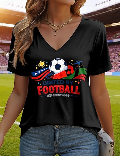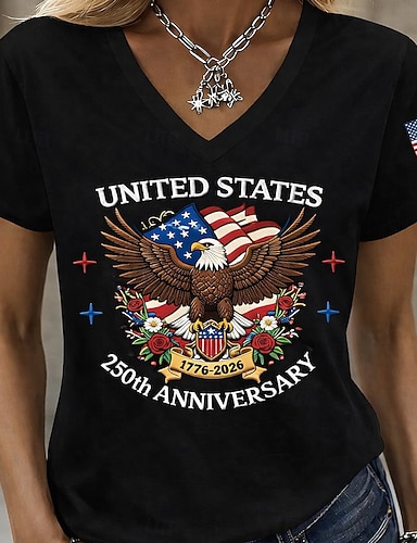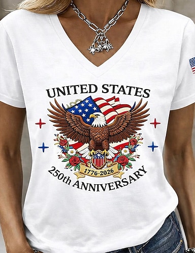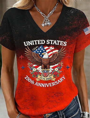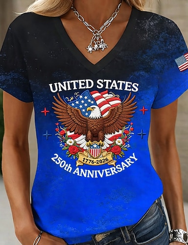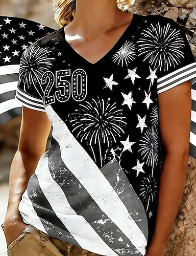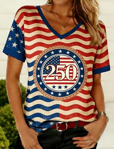 Amerikanischer Unabhängigkeitstag Damen T Shirt Druck Grafik Flagge Vintage Stilvoll Klassisch Kurzarm V Ausschnitt Normale Oberteile Täglich Blau Schwarz Weiß Rote Sommer Frühling