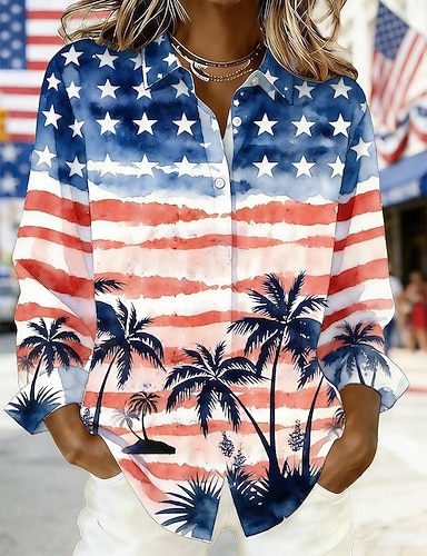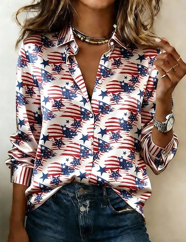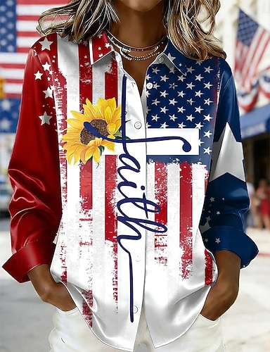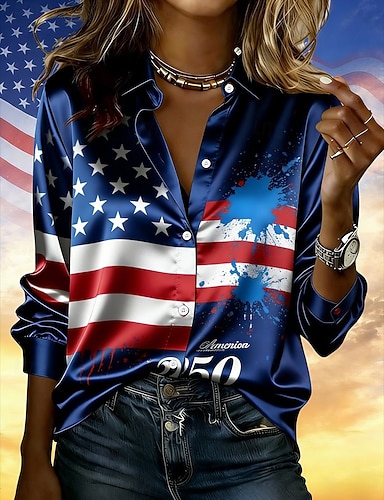 Amerikanischer Unabhängigkeitstag Damen Hemd Bluse Patchwork Knöpfe Druck Grafik Flagge Vintage Stilvoll Lässig Langarm Hemdkragen Normale Oberteile Täglich Blau Rote Sommer Frühling Herbst Winter