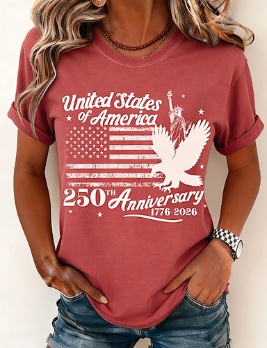 Unabhängigkeitstag Patriotische Damen T-Shirt Grafik Flagge Stylisch Lässig Rot Weiß Blau Kurzarm Rundhals Reguläre Oberteile Täglicher Wochenend Druck Wein Sommer Frühling
