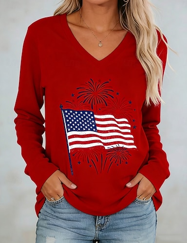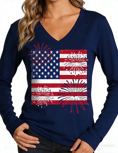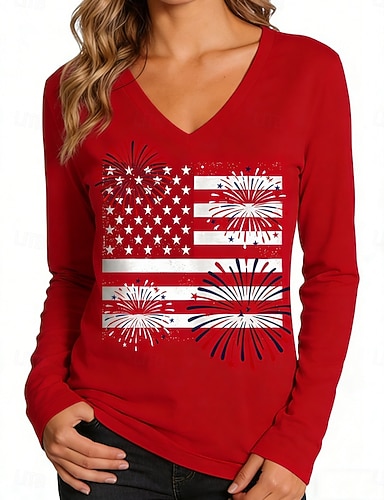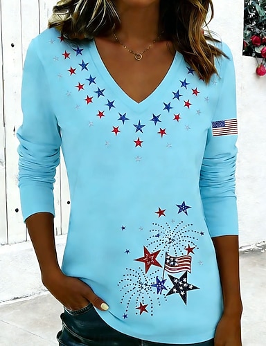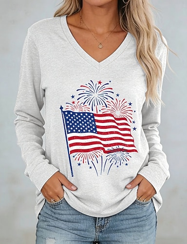 Amerikanischer Unabhängigkeitstag Damen T Shirt T-Shirt Druck Blumen Grafik Stilvoll Klassisch Lässig Langarm V Ausschnitt Normale Oberteile Täglich Ausgehen Blau Weiß Rote Hellgrau Sommer Frühling