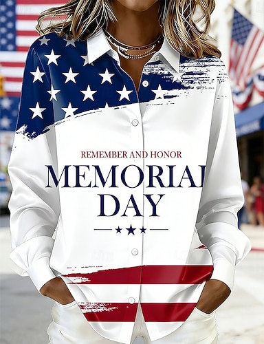 Amerikanischer Unabhängigkeitstag Damen Hemd Knöpfe Druck Flagge Vintage Lässig Langarm Hemdkragen Normale Oberteile Täglich Rote Frühling Herbst Winter