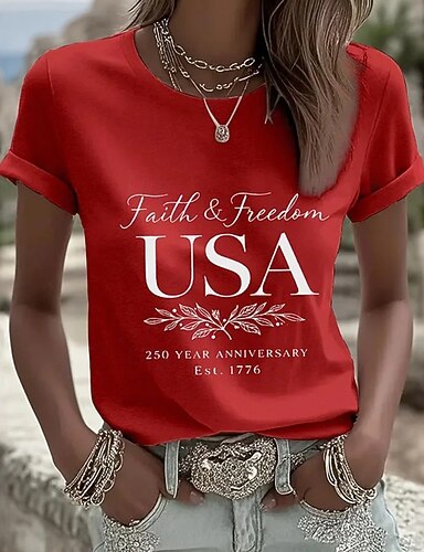 Amerikanischer Unabhängigkeitstag Damen T Shirt Druck Grafik Buchstabe Amerikanische Flagge Vintage Stilvoll Klassisch Kurzarm Rundhalsausschnitt Normale Oberteile Täglich Schwarz Weiß Rote Rot