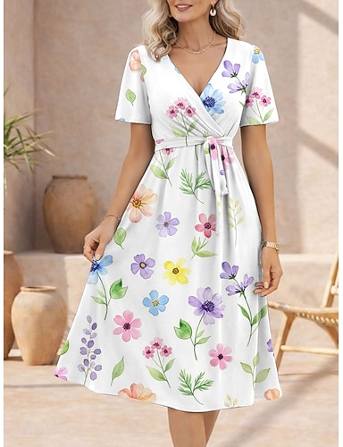 Damen Midikleid A Linie Kleid Bandage Kleid Rüschenkleid Urlaub Lässig Ferien Date Normale Passform Blumen Grafik Kurzarm V Ausschnitt Blau Weiß Rosa Grün Sommer Frühling