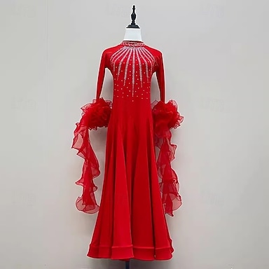Gesellschaftstanz Kleid Strass Falten Spleißen Damen Party Training Leistung Langarm Hoch Spandex Polyester