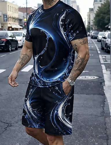 Herren Geometrisch 2St T-Shirts-Sets Sommeroberteile Kurzarm Kurze Hosen Rundhalsausschnitt Sport Lässig Trendy Täglich Outdoor Urlaub 3D-Druck Sommer Blau Rote Purpur