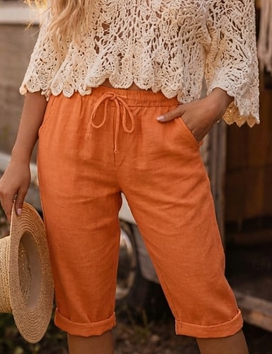 Damen Kunstbaumwollleinen Chinos Sommershorts Schnitt Urlaub Streetwear Lässig Knielang Mittlere Taillenlinie Einfach Kordelzug Tasche Bequem Atmungsaktiv Unelastisch Täglich Outdoor Straße
