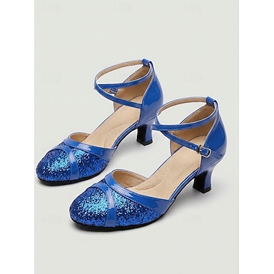 blaue und silberne Glitzer-Tanzschuhe mit überkreuzten Riemen – niedriger Absatzkomfort für Gesellschaftstanz und Bühnenbekleidung