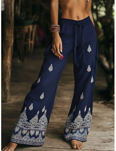 Damen Weites Bein Sommerhose Hosen Hose Urlaub Streetwear Lässig Volle Länge Mittlere Taillenlinie Grafik Geometrisch Kordelzug Tasche Drucken Bequem Unelastisch Täglich Outdoor Urlaub Dunkelmarine
