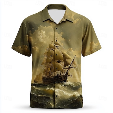Herren Nautisch Wolken Segelboot Hemd Sommerhemd Knopfhemd Kurzarm Vintage-Retro Outdoor Urlaub Alltagskleidung Sommer Frühling Umlegekragen 3D-Druck Hemden mit Kragen Olive