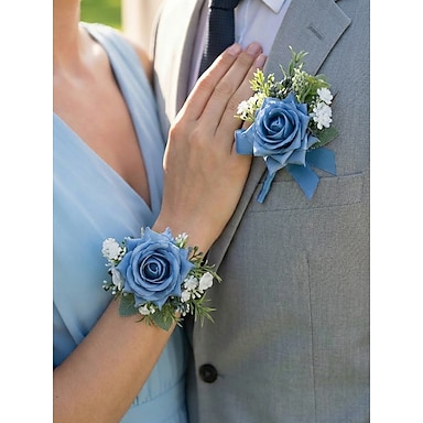 Hochzeits-Boutonnière und Handgelenk-Corsage-Set für Herren aus hellblauem, staubigem Polyestergewebe mit künstlichem Blumenmuster für Bräutigame, Abschlussball, Partys und formelle Abendveranstaltungen.