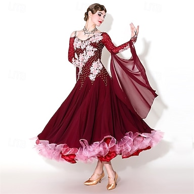 Elegantes Damen-Ballsaalkleid mit Strass-Blumenapplikationen, geeignet für Walzer, Tango, Modern Rumba, Wettbewerbe und Aufführungen in Bordeauxrot
