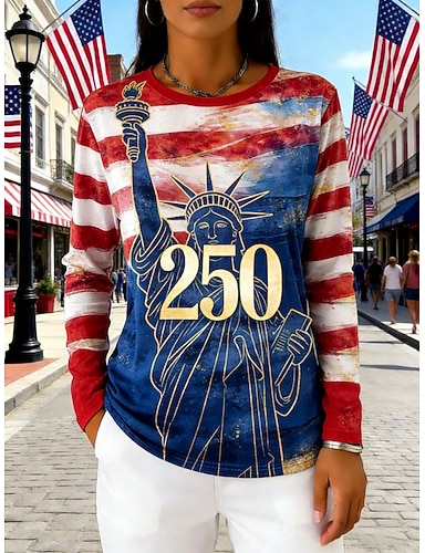 Unabhängigkeitstag Patriotisches Damen T-Shirt Grafik Flagge Mode Stylisch Klassisch Lange Ärmel Rundhals Reguläre Oberteile Täglicher Wochenenddruck Blau Weiß Rot Rot Blau Sommer Frühling Herbst