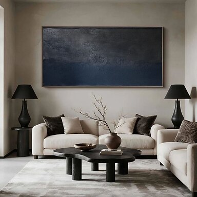 handgemaltes, strukturiertes, abstraktes Acrylgemälde in Schwarz und Dunkelblau auf grauer Leinwand, Wandkunst in Blau, abstraktes Gemälde, moderne minimalistische Wandkunst