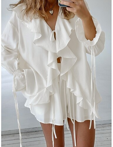 Damen Hemd Zweiteilige Sets Shorts-Sets Langarm V Ausschnitt Einfach Rüsche Mode Streetwear Lässig Täglich Outdoor Weiß Beige Sommer Normale Passform