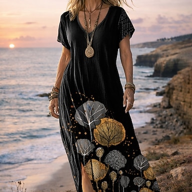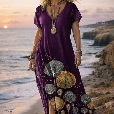 Damen Maxikleid Boho-Kleid Freizeitkleid A Linie Kleid Druckkleid Vintage Outdoor Strand Urlaub Normale Passform Blumen Grafik Kurzarm V Ausschnitt Purpur Sommer Frühling