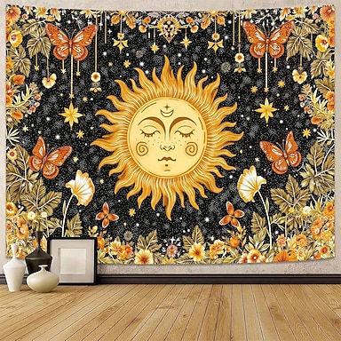 Sonnen-Wandteppich, himmlisch, Boho-Stil, Schmetterlinge, Sterne, Blumen, Yoga-Raum, Meditationsdeko, spirituelle Zen-Kunst, Stoffposter für das Wohnzimmer