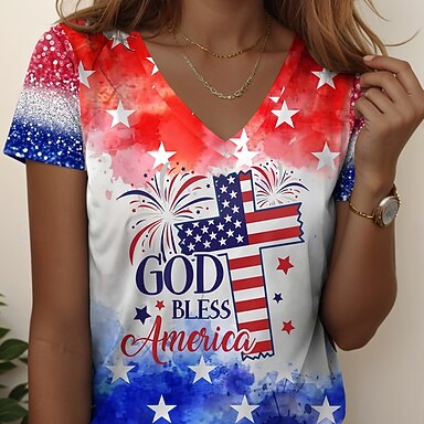 Amerikanischer Unabhängigkeitstag Damen T Shirt T-Shirt Druck Grafik Flagge Stilvoll Klassisch Lässig Kurzarm V Ausschnitt Normale Oberteile Täglich Ausgehen Wochenende Blau Rote Rot / Blau Sommer