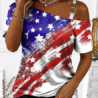 Amerikanischer Unabhängigkeitstag Damen T Shirt Druck Grafik Flagge Vintage Mode Lässig Kurzarm V Ausschnitt Normale Oberteile Täglich Blau Weiß Rote Sommer Frühling