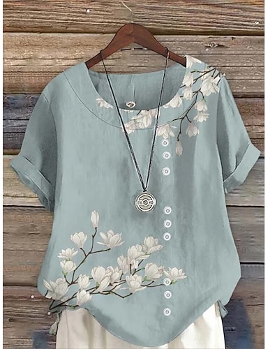 Damen Bluse Knöpfe Druck Blumen Grafik Vintage Tropisch Stilvoll Kurzarm Rundhalsausschnitt Lange Oberteile Ferien Salbeigrün Rote Grün Sommer Frühling