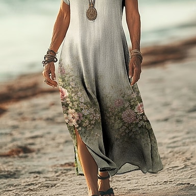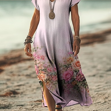Damen Kleid Set Maxikleid A-Linien Kleid Sommerkleid Urlaub Ombre Grafik Schichten Druck Maxikleid 3/4 Länge Ärmel V-Ausschnitt Alltag Outdoor Blau Lila Grün Frühling Herbst Reguläre Passform