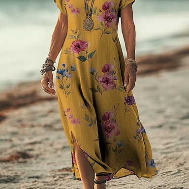 Damen kleid lang Casual kleid Schaukelkleid Kleid drucken Modisch Strassenmode Reifen Outdoor Urlaub Täglich Regular Fit Blumen Langarm Gespaltener Hals Rote Purpur Grün Dunkelblau Herbst Winter