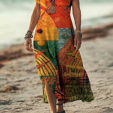 Damen Midikleid Boho-Kleid Freizeitkleid A Linie Kleid Druckkleid Vintage Outdoor Urlaub Wochenende Normale Passform Farbblock Kurzarm V Ausschnitt Regenbogen Sommer Frühling