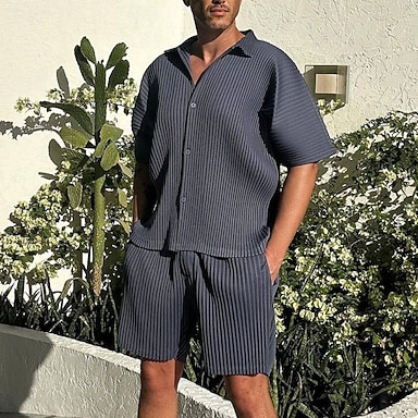 Herren Rippenstrick Zweiteilig Hemd Set Und Shorts Strandshorts Set Einfach Täglich Outdoor Urlaub Umlegekragen Kurzarm Sommer Mode Lässig Bequem Bekleidung