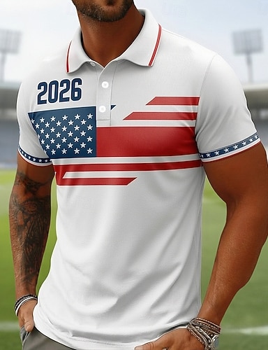 Fußball-Pokal 2026 Herren Amerikanische US-Flagge Poloshirts Kurzarm Polo-Shirts Hemden mit Kragen Lässig Athleisure 3D-Druck Frühling & Sommer Weiß
