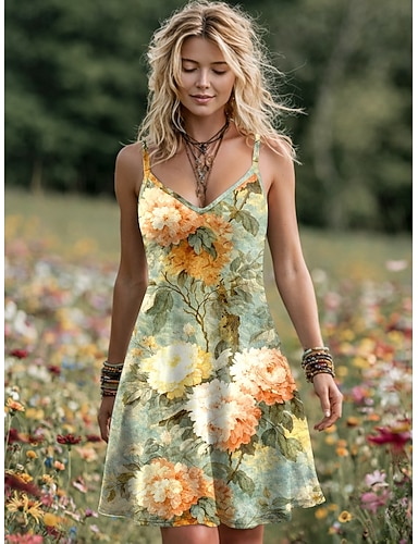Damen Mini Kleid Boho A-Linien Kleid Slip Kleid Urlaub Casual Ausgehen Reguläre Passform Floral Grafik Ärmellos V-Ausschnitt Blau Rot Lila Grün Sommer Frühling