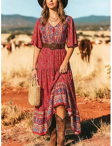 Damen Maxikleid Boho-Kleid Freizeitkleid Blumenkleid Elegant Mode Modern Outdoor Strand Urlaub Lässiger Schnitt Paisley-Muster Kurzarm V Ausschnitt Blau Schwarz Gelb Rote Sommer Frühling
