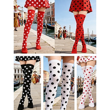 Damen Mardi Gras 5er-Pack gepunktete über die Knie Socken bunte Karneval-Kostümsocken dehnbare Retro-Partysocken für Festivals und Maskerade-Feiern