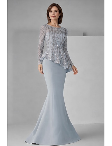 Meerjungfrauenschnitt Bodenlang Perlenbestickt Kleid für Hochzeitsgäste Abendkleid Brautmutterkleid Langarm U-Boot-Ausschnitt Elegant Formell Hochzeitsgast Stretch-Crêpe mit Perlenstickerei Rüschen