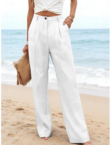 Damen Kunstbaumwollleinen Weite Hosenbeine Chinos Sommerhose Urlaub Streetwear Basic Volle Länge Mittlere Taillenlinie Einfach Tasche Elastischer Bund Bequem Komfort Dehnbar Täglich Outdoor Straße