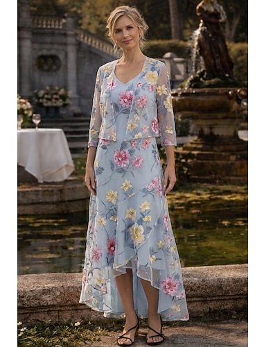 Zweiteilig A-Linie Tee-Länge Kleid für Hochzeitsgäste Brautmutterkleid Ärmellos Dreiviertelarm V Ausschnitt Elegant Einfach Formell Kentucky Derby Semi-Formal Organza Jacquard Kurze Jackenkleider mit