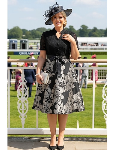A-Linie Knielang Derby-Kleid Brautmutterkleid Kurzarm V Ausschnitt Hoher Ausschnitt Elegant Bauch verstecken Kentucky Derby Satin Spitze mit Spitze Schleife(n) Druck