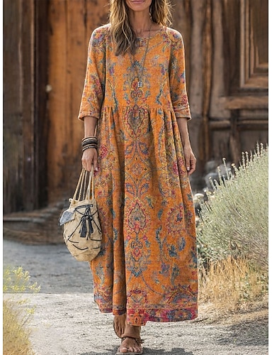 Frauen Maxi Kleid Leinenähnlich Boho Lässiges Kleid Elegantes Bohemia Strand Lockerer Sitz Floral Paisley Farbblock 3/4 Länge Ärmel Rundhalsausschnitt Blau Gelb Pink Orange Sommer Frühling Herbst