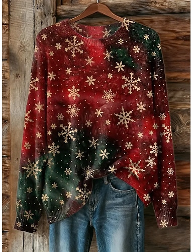 Damen Pullover Täglich Lässig Grafik Schneeflocken Gerippt Rundhalsausschnitt Gestrickt Druck Langarm Normale Oberteile Stricken Outdoor Wochenende Rote Herbst Winter
