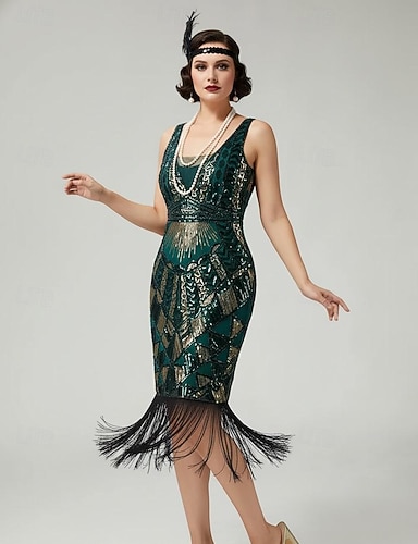 Goldene Zwanziger 1920er Knielang Flapper Kleid Ärmellos Der große Gatsby Pailletten Fransen V Ausschnitt Kostüm Damen Weihnachten Karneval Maskerade Retro-Mottoparty Charleston-Tanz Erwachsene Kleid