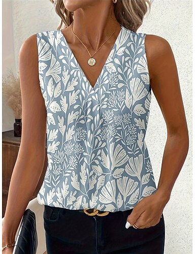 Damen T Shirt Tank Top Ärmelloses Shirt T-Shirt Einfarbig Grafik Pflanzen Elegant Bohemien Mode Ärmellos Hoher Ausschnitt Normale Oberteile Täglich Ausgehen Wochenende Blau Sommer Frühling