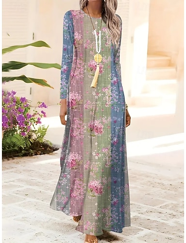 Damen Maxikleid Shiftkleid A Linie Kleid Party Lässig Boho Täglich Date Ausgehen Normale Passform Blumen Grafik Batik Langarm Rundhalsausschnitt Blau Hellgrün Rosa Violett Frühling Herbst Winter