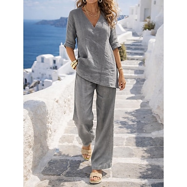 Damen Baumwoll-Leinen-Sets Dreiviertelarm Einfach Urlaub Täglich Blau Schwarz Hellgrün Sommer Lässiger Schnitt