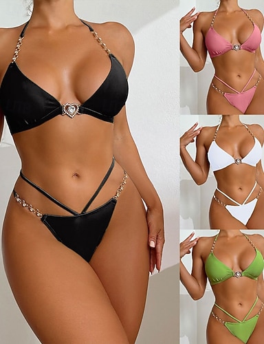 Damen Bikini 2-teiliges Badeanzug String Slim Rückenfreier Urlaub Strandbekleidung Einfarbiger Halter-Ausschnitt Ärmelloser Badeanzug