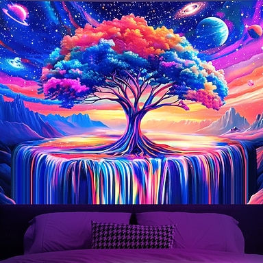 Schwarzlicht Wandteppich UV reaktiv im Dunkeln leuchtend Party Neon Lebensbaum psychedelisch trippig neblig hängender Wandteppich Wandbild für Wohnzimmer Schlafzimmer