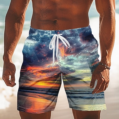 Herren Ozean Landschaft Sonnenuntergang Badehosen Badeshorts Boardshorts Mittlere Taille Streetwear Hawaiianisch Urlaub Seitentaschen Netzfutter Elastischer Kordelzug in der Taille Designer Bekleidung