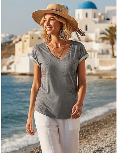 Damen T Shirt Druck Blumen Grafik Bohemien Vintage Lässig Kurzarm V Ausschnitt Normale Oberteile Täglich Grau Sommer Frühling