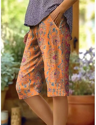 Damen Shorts aus Baumwollleinen Urlaub Vintage Küsten-Oma-Stil Knielang Mittlere Taille Blumen Grafik Druck Komfort Unelastisch Täglich Outdoor Straße Blau Rot orange kleiner Finger Amethyst Sommer