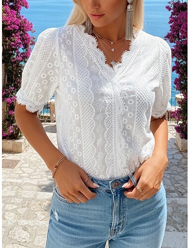 Damen Hemd Boho-Hemd Bluse Spitze Einfarbig Stilvoll Lässig Kurzarm V Ausschnitt Normale Oberteile Täglich Weiß Sommer Frühling